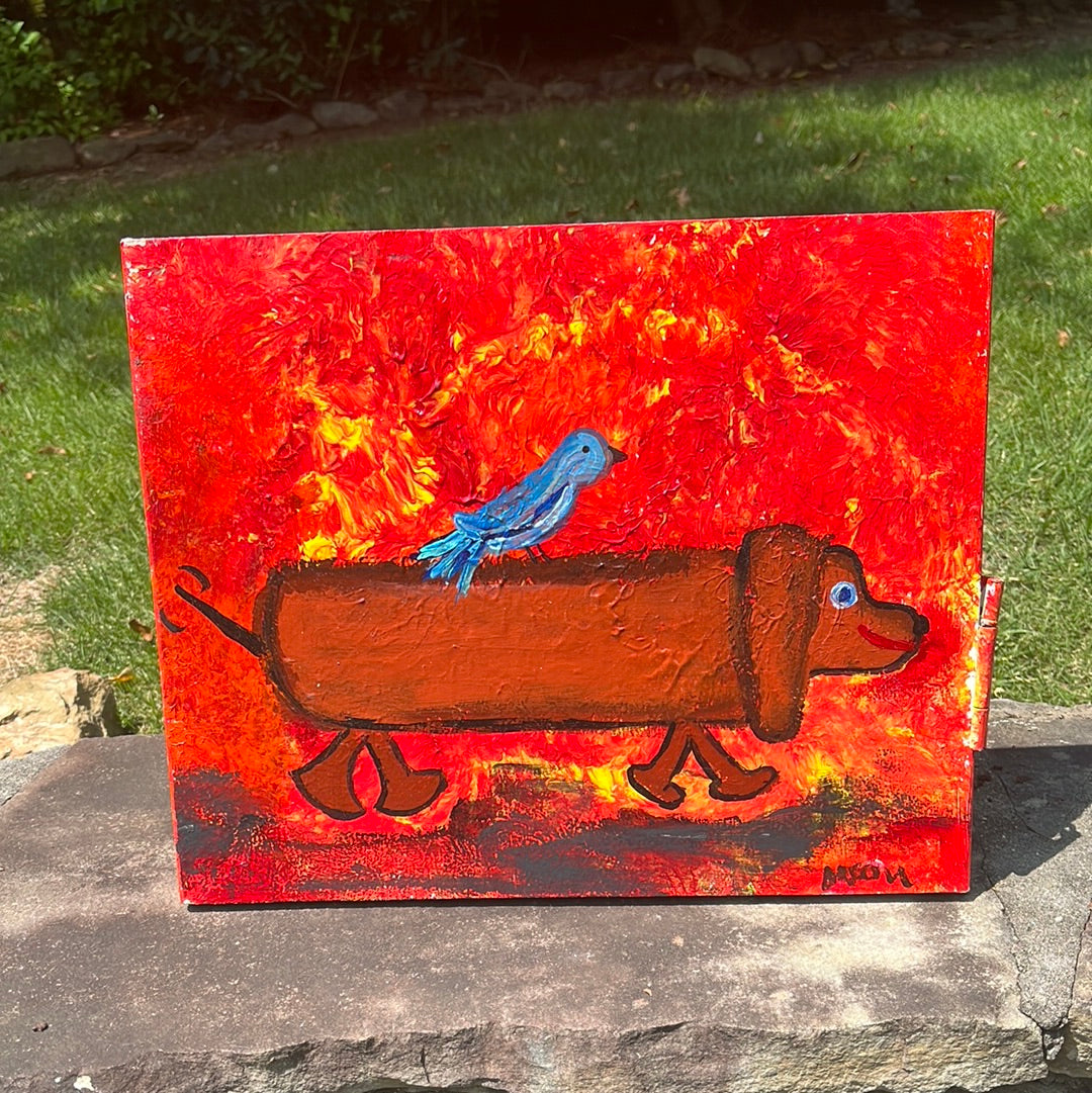 Acrylics and gloss varnish on part of reclaimed door with hinge. Wired and ready to hang. Can be hung inside or outside on porch or deck.