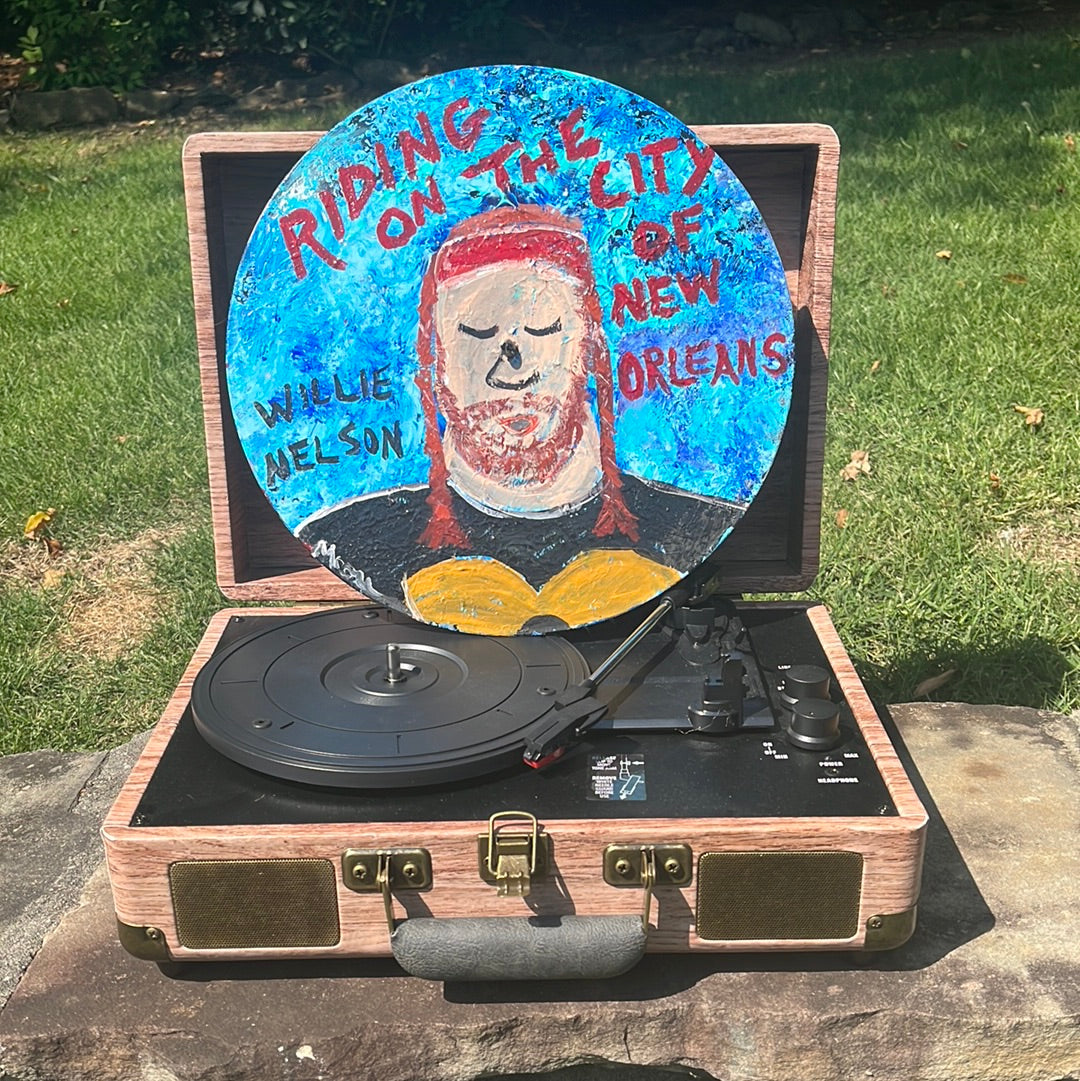 Acrylics and gloss varnish on reclaimed vinyl record. Has hook on back and ready for hanging.